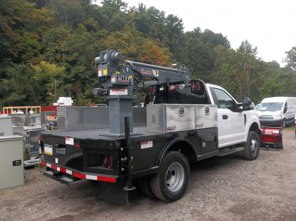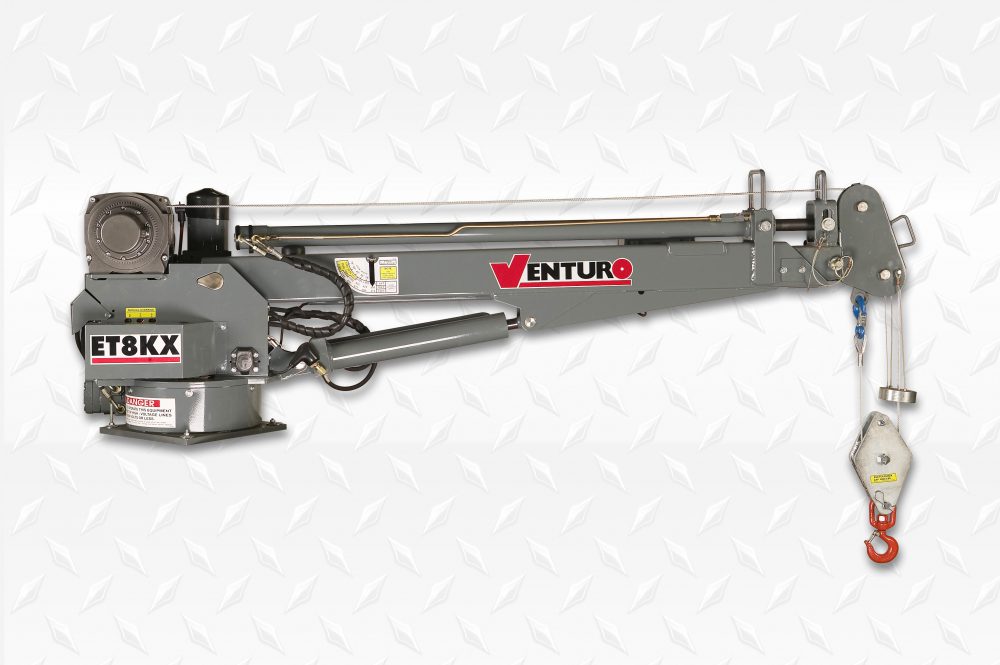 The Venturo ET8KX is a 8,000 ft-lb electric-hydraulic service crane with a 3,200 lb lifting capacity featuring 12V DC electric winch, hydraulic rotation, hydraulic boom elevation with a hydraulic extension and secondary manual extension. The ET8KX also has optional proportional controls which allow the operator additional control over speeds of the hydraulic functions.