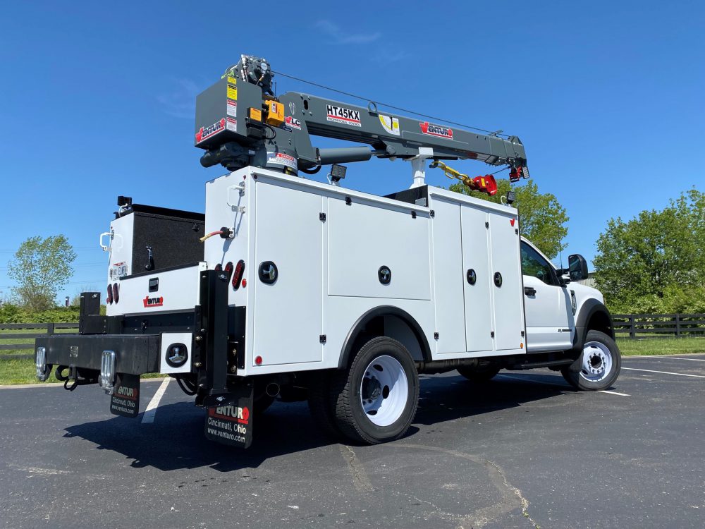 The Venturo HT45KX with VLC™ controls features a maximum capacity from 7,500 – 7,800 lbs.  Venturo’s new Electronic Crane Control Management System provides added safety and benefits for crane operators.  Benefits include a standard, wireless, pistol-grip controller, overload protection which controls and prevents any type of overload, LCD Display Screen alerts, transmitter handle vibrations, green/yellow/red alert lights under boom, and corresponding lights on the receiver. The LCD display shows percentage of load, boom angle in degrees and percentage of total capacity during crane operation. The VLC™ system also provides vehicle stability and grade control.
